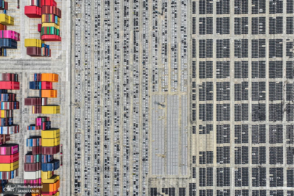 نانجینگ، چین/ نمای هوایی از صف خودروها برای صادرات در بندری در نانجینگ