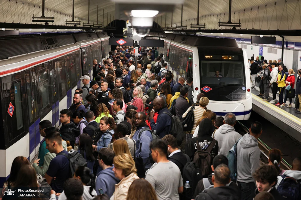 مادرید، اسپانیا/ مسافران پس از قطعیهای گسترده برق که اسپانیا و پرتغال را تحت تأثیر قرار داد، در حالی که فعالیت مترو تا حدودی از سر گرفته شده روی سکوها ازدحام کرده اند