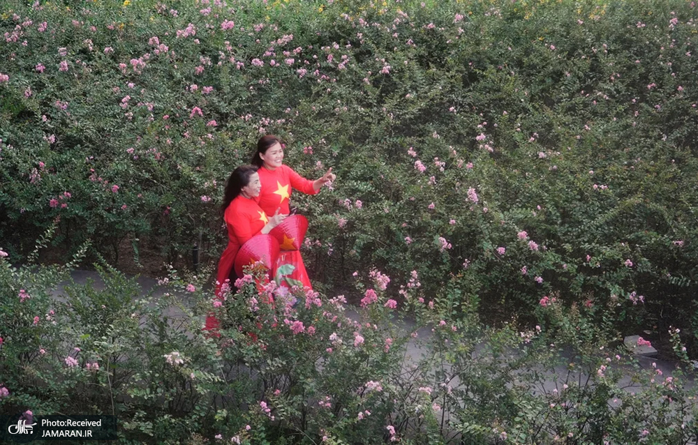 هوشی مین، ویتنام/ زنان با لباس سنتی و با پرچم ویتنام، در پارک قدم می زنند