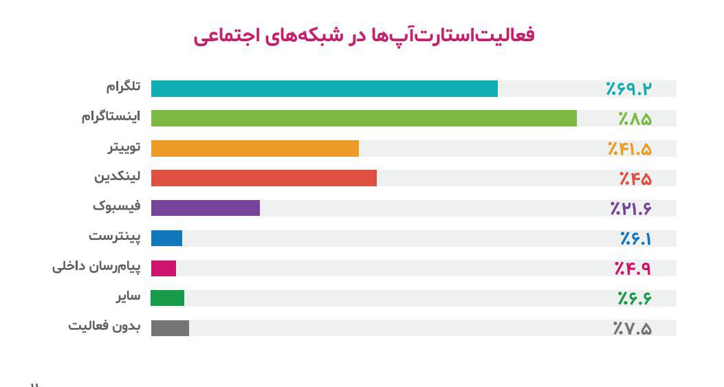 69.2 درصد آن ها از تلگرام، 85 درصد از اینستاگرام، 41.5 درصد از توییتر، 45 درصد از لینکدین، 21.6 درصد از فیسبوک و
