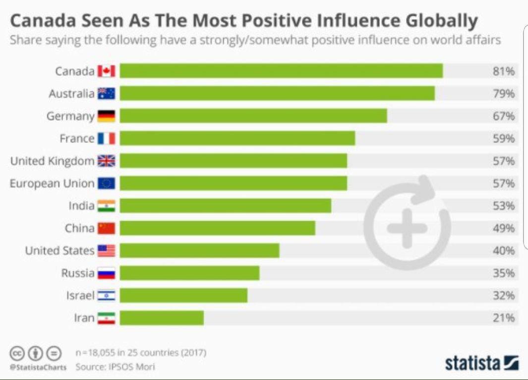به گزارش جی پلاس، مجمع جهانی اقتصاد با انتشار یک اینفوگرافی، کانادا را به عنوان کشوری که بیشترین تأثیرگذاری مثبت را در جهان دارد معرفی کرد. ایران نیز در رتبهی دوازدهم این لیست قرار دارد.
