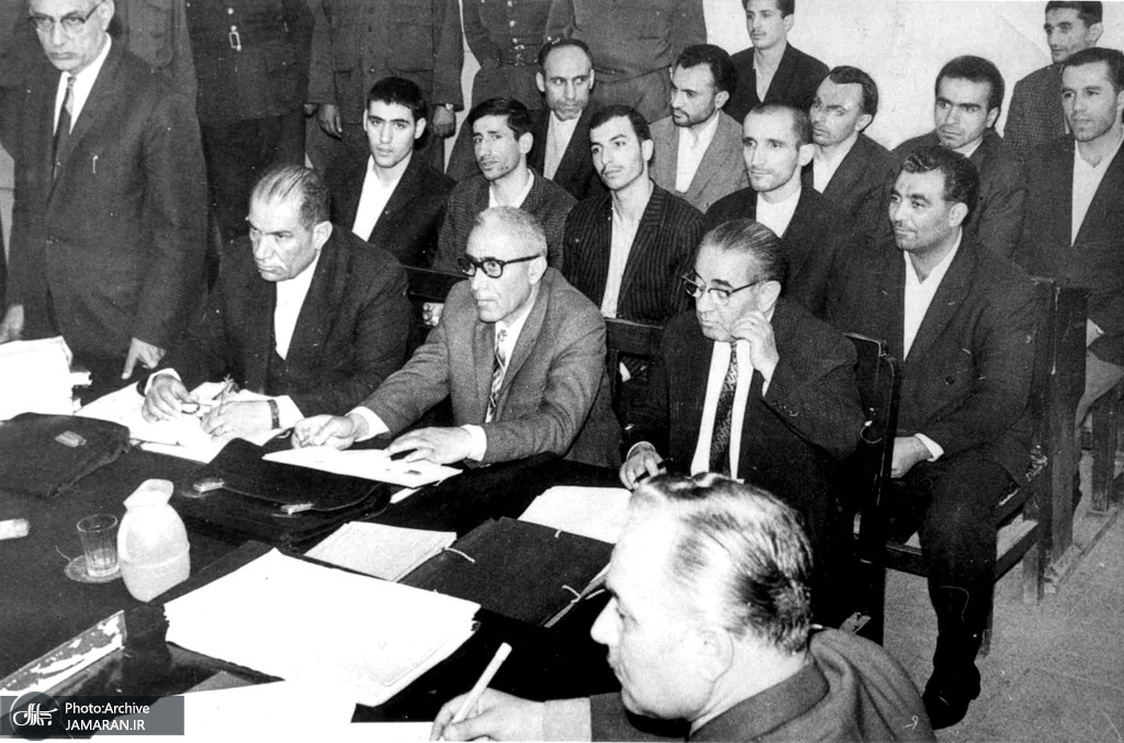 رضا صفارهرندی، محمد بخارایی، محمد صادق امانی، مهدی عراقی و محمد نیک نژاد در دادگاه نظامی شاه(دادگاه ترور حسنعلی منصور) سال 1344