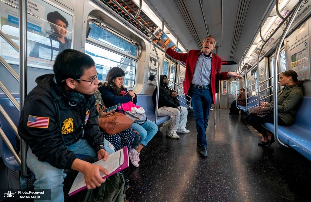 ریچارد مک لاچلان، یکی از فعالان محیط زیستی، در حال صحبت بامسافران مترو در مورد تغییرات آب و هوایی. عکس: Don Emmert, AFP