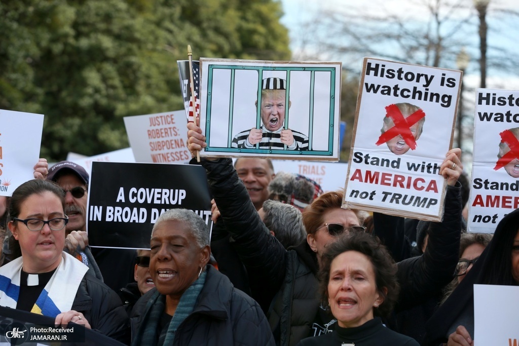 صدها نفر از ساکنان واشنگتن با برگزاری تجمع اعتراض آمیز در محوطه ورودی شرقی ساختمان سنای آمریکا خواستار حضور شاهدان، از جمله «جان بولتون» در جلسه دادگاه استیضاح دونالد ترامپ در مجلس سنا شدند. عکس: Kirk McKoy, LosAngeles Time