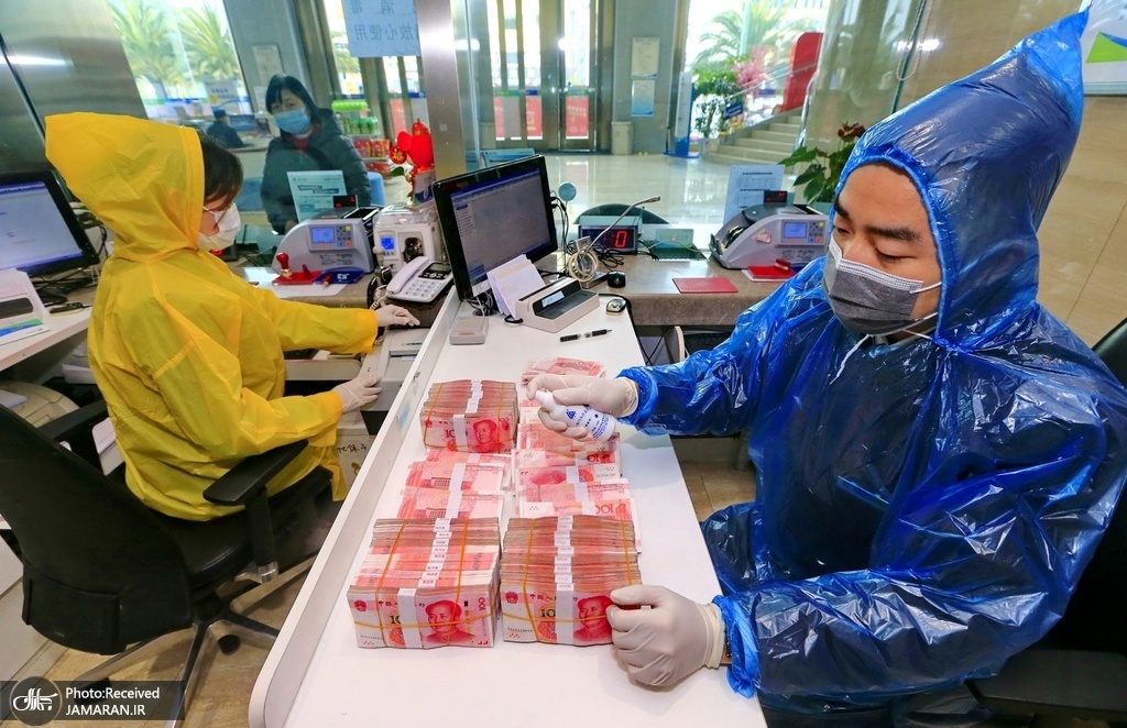 کارمند یک بانک در حال ضد عفونی اسکناس ها در استان سیچوان چین. عکس: Chinatopix Via AP