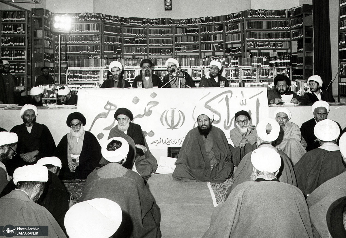 سخنرانی آیت الله مشکینی در سمینار ائمه جمعه در کتابخانه مدرسه فیضیه قم . شهید رجایی و آیت الله العظمی منتظری در تصویر دیده می شوند.