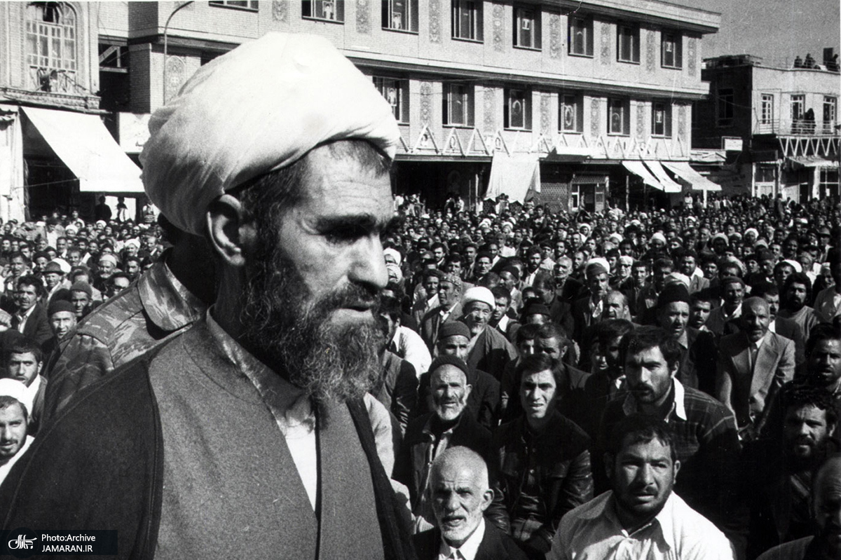 آیتالله حاج شیخ علی مشکینی(ره) در حال اقامه نماز به همراه آیتالله العظمی محمدفاضل لنکرانی(ره) پس از یکی از راهپیمایی های انقلاب در شهر قم.