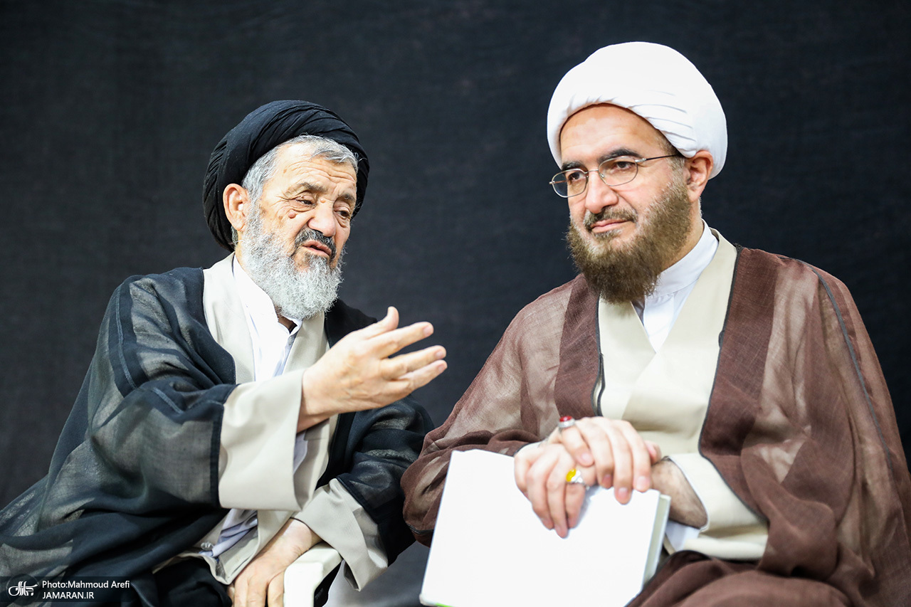 آیت الله محمدحسن اختری، برادر مرحوم آیت الله اختری و رئیس شورای عالی مجمع جهانی اهل بیت (ع) در حال خوشامدگویی به آیت الله محسن قمی، عضو مجلس خبرگان رهبری