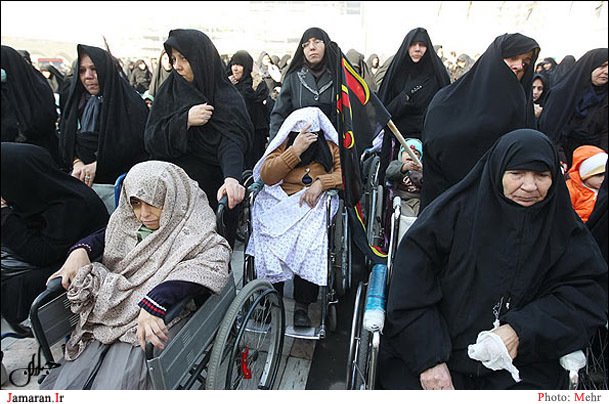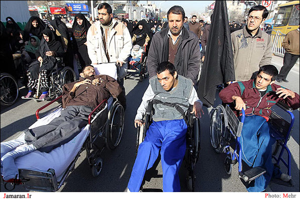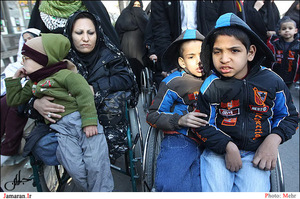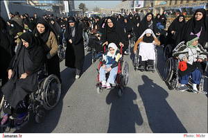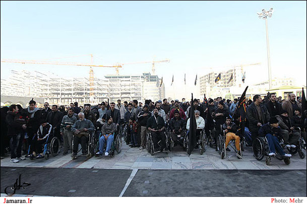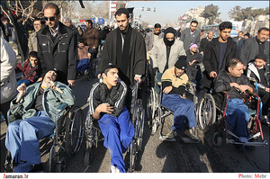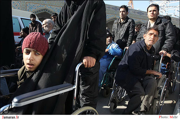 جمعی از معلولین جسمی و حرکتی در آستانه شهادت امام رضا(ع) در قالب دسته عزاداری تا حرم مطهر راهپیمایی کردند.