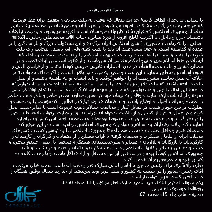 تنفیذ حکم ریاست جمهوری شهید رجایی از سوی امام خمینی (س)