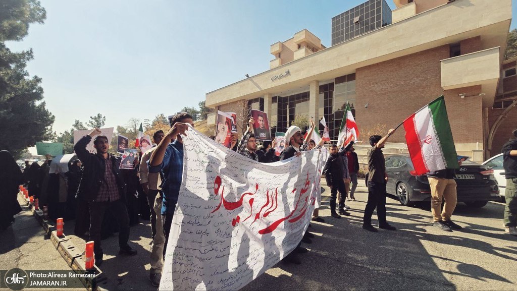 جلوی دانشکده مهندسی هستهای دانشجویان معترض متفرق شدند و اکثریت با دانشجویان بسیجی بود که به یادگار تصویری با سر در دانشکده هستهای و در دست داشتن تصویر شهدا ثبت کردند، تا در خاطر همگان بماند اسرائیل استاد دانشگاه شهید بهشتی را به شهادت رساند، اما خیال باطل اینکه روزی بتواند به فکر و هویت دانشجویان این دانشگاه دست درازی کند را به گور خواهد برد.