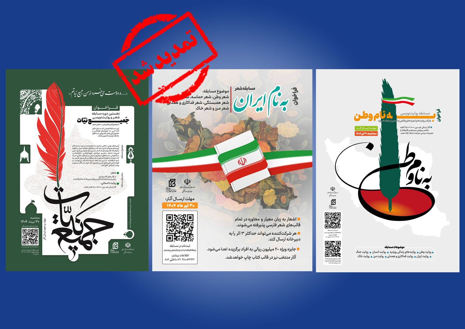 مهلت ارسال آثار به مسابقات ادبی «جمیع نیات»، «به نام وطن» و «به نام ایران» تا پنجم مرداد ۱۴۰۴ تمدید شد.