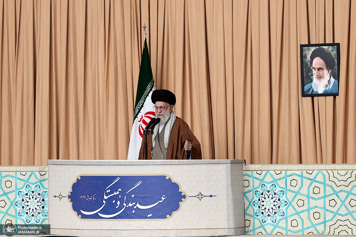 أمّ قائد الثورة الإسلاميّة، صباح يوم الإثنين 31/03/2025، صلاة عيد الفطر السعيد، في مصلّى الإمام الخميني (قده) بالعاصمة طهران، بمشاركة حشود غفيرة من الناس. وبعد الصلاة ألقى سماحته خطبة بارك فيها للأمّة الإسلاميّة حلول عيد الفطر السعيد، مشدّدًا على وجوب اجتثاث العصابة الصهيونية الإجراميّة من فلسطين، وعدّ هذا أمرًا دينيًّا وأخلاقيًّا وإنسانيًّا. وأكّد قائد الثورة الإسلاميّة أن أيّ خباثة قد ترتكبها أمريكا والكيان الصهيوني ستُواجه حتمًا بضربة مضادّة قويّة.