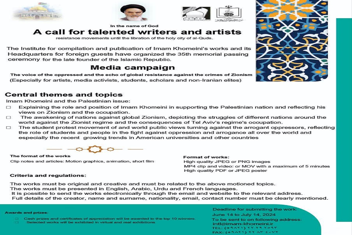 Institute calls for talented writers and artists to highlight Imam۰۳۹;s ideals on Palestine
