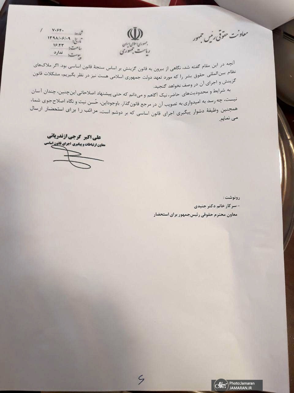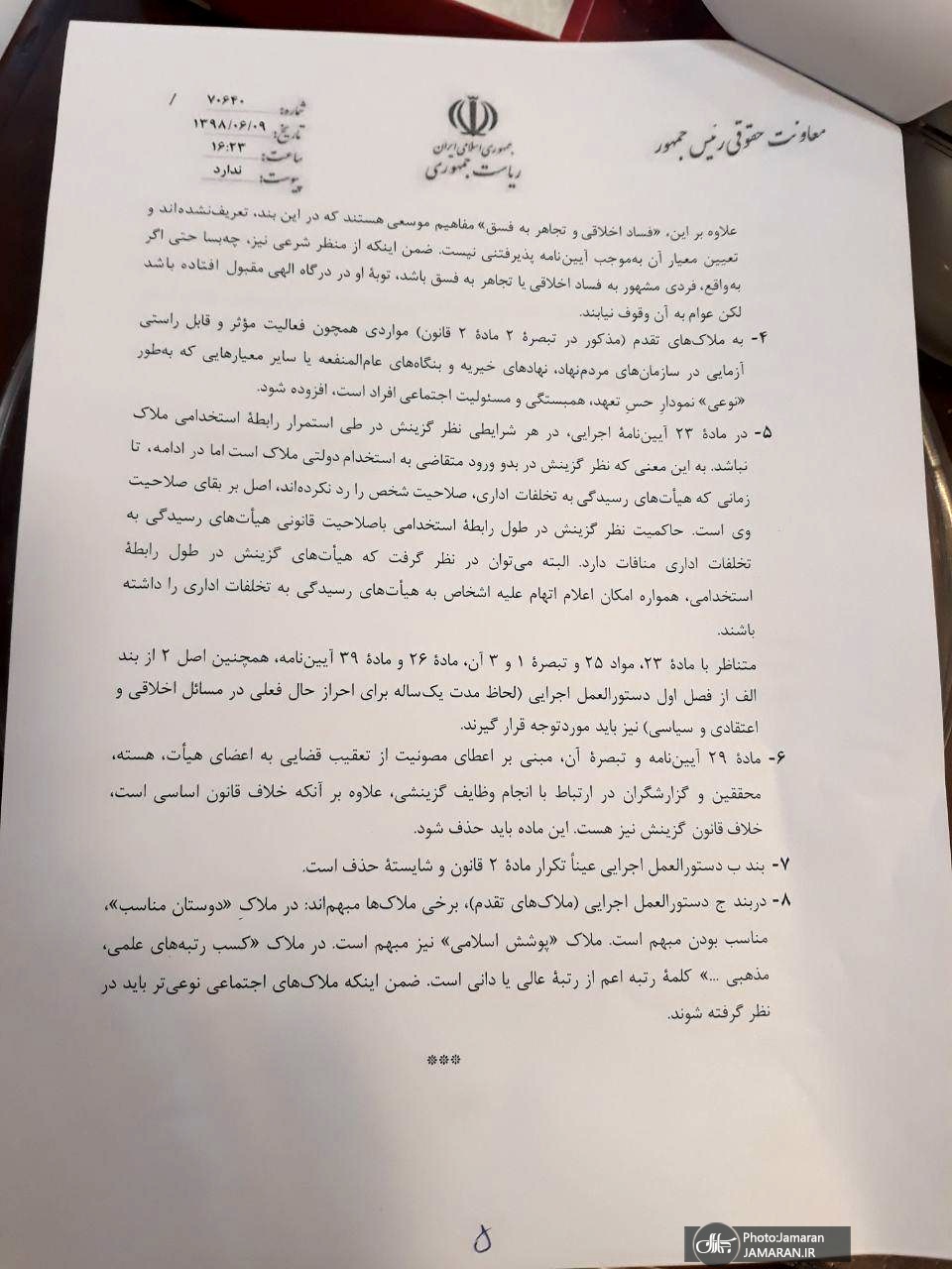 او در بخشی از این نامه متذکر میشود که قانون گزینش معلمان، کارکنان آموزشوپرورش، وزارتخانهها، سازمانها، مؤسسات و شرکتهای دولتی با قانون اساسی، موازین شرعی و فرمان تاریخی امام خمینی(ره)(اینجا بخوانید) مغایرت دارد.