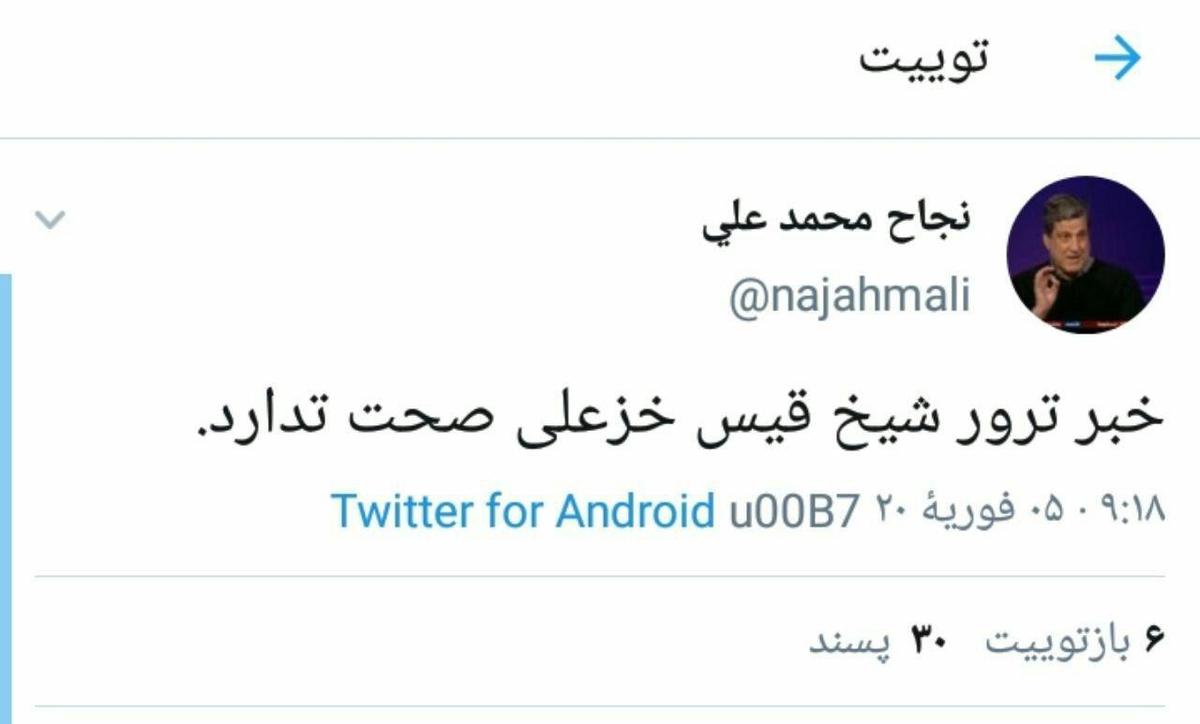 به گزارش جماران، در حالی که ساعتی پیش شبکه سعودی العربیه در خبری فوری مدعی شد: شیخ قیس الخزعلی، فرمانده عصائب اهل الحق عراق در حمله پهپادی آمریکا کشته شده است؛ نجاح محمدعلی، کارشناس عراقی حوزه بین الملل و خاورمیانه در پیامی توئیتری نوشت: « خبر ترور شیخ قیس خزعلی صحت ندارد»
