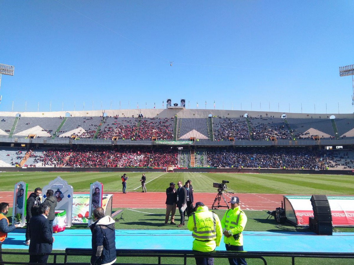 * بلندگوهای ورزشگاه آزادی سرودهایی با مضمون دهه فجر پخش میکنند.