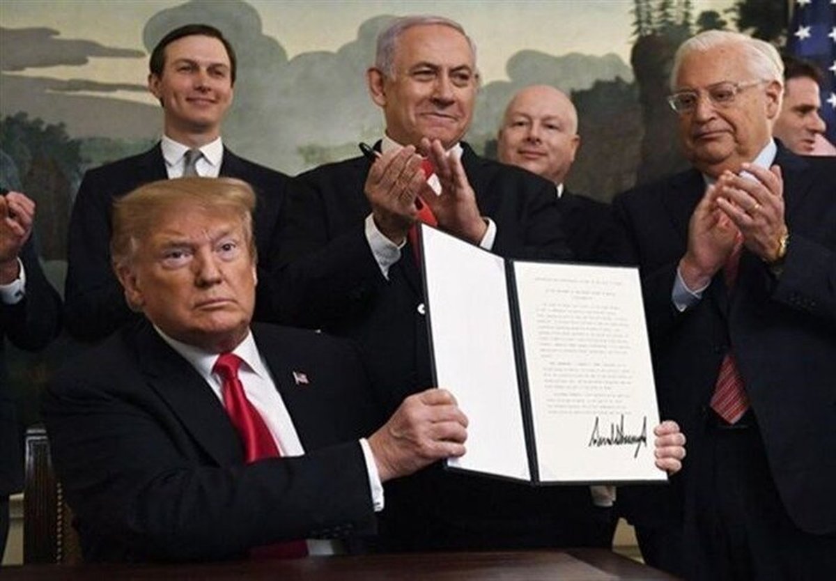 رئیس جمهوری آمریکا روز سه شنبه هشتم بهمن ماه ۱۳۹۸ در کنفرانس مطبوعاتی مشترک با بنیامین نتانیاهو نخست وزیر رژیم صهیونیستی، برای نخستین بار از طرح سازش خود موسوم به «معامله قرن» در کاخ سفید پرده برداشت و اعلام کرد که شهر قدس پایتخت یکپارچه رژیم صهیونیستی باقی میماند.