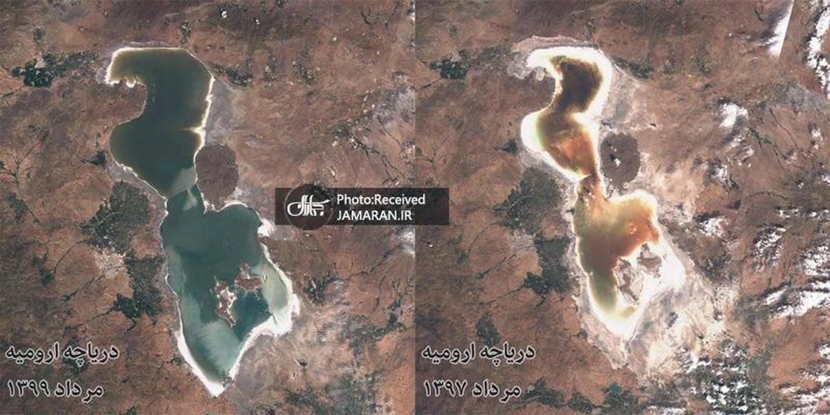 دو عکس از دریاچه ارومیه که دو سال پیش و دو روز پیش گرفته شدند نشان دهنده تغییر وضعیت و احیای این دریاچه هستند.