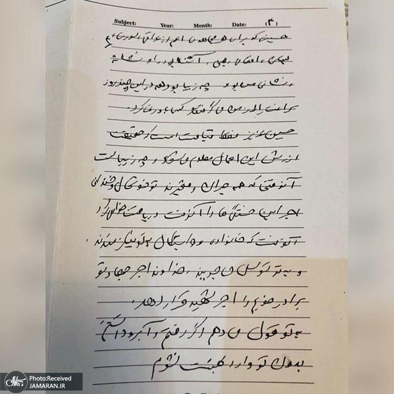 حسین عزیز تو نسبتی با من داشتی که حتما فرزندانت با شما و شما با فرزندانت نداشته ای و فرزندانم هم با من نداشته اند. همیشه نه تنها از جسمم مراقبت می کردی، بلکه مراقب روحم هم بودی. اصرار به استراحت، اصرار به خوردن، خوابیدن و . . . بیش از احساس یک فرزند به پدرش بود. بیست سال اخیر پیوسته مراقبت کردی که تمام وقت من صرف اسلام و جهاد شود و اجازه ندادی وقت من بیهوده هدر رود.