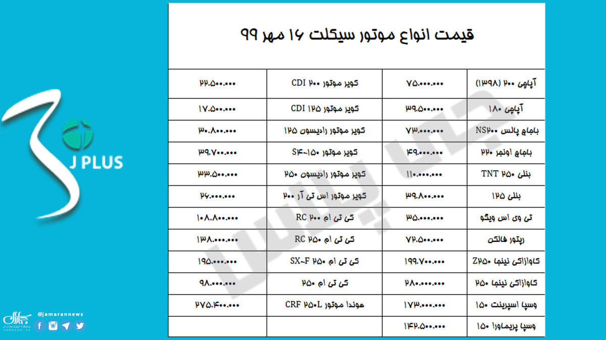 قیمت انواع موتور سیکلت به شرح زیر است: