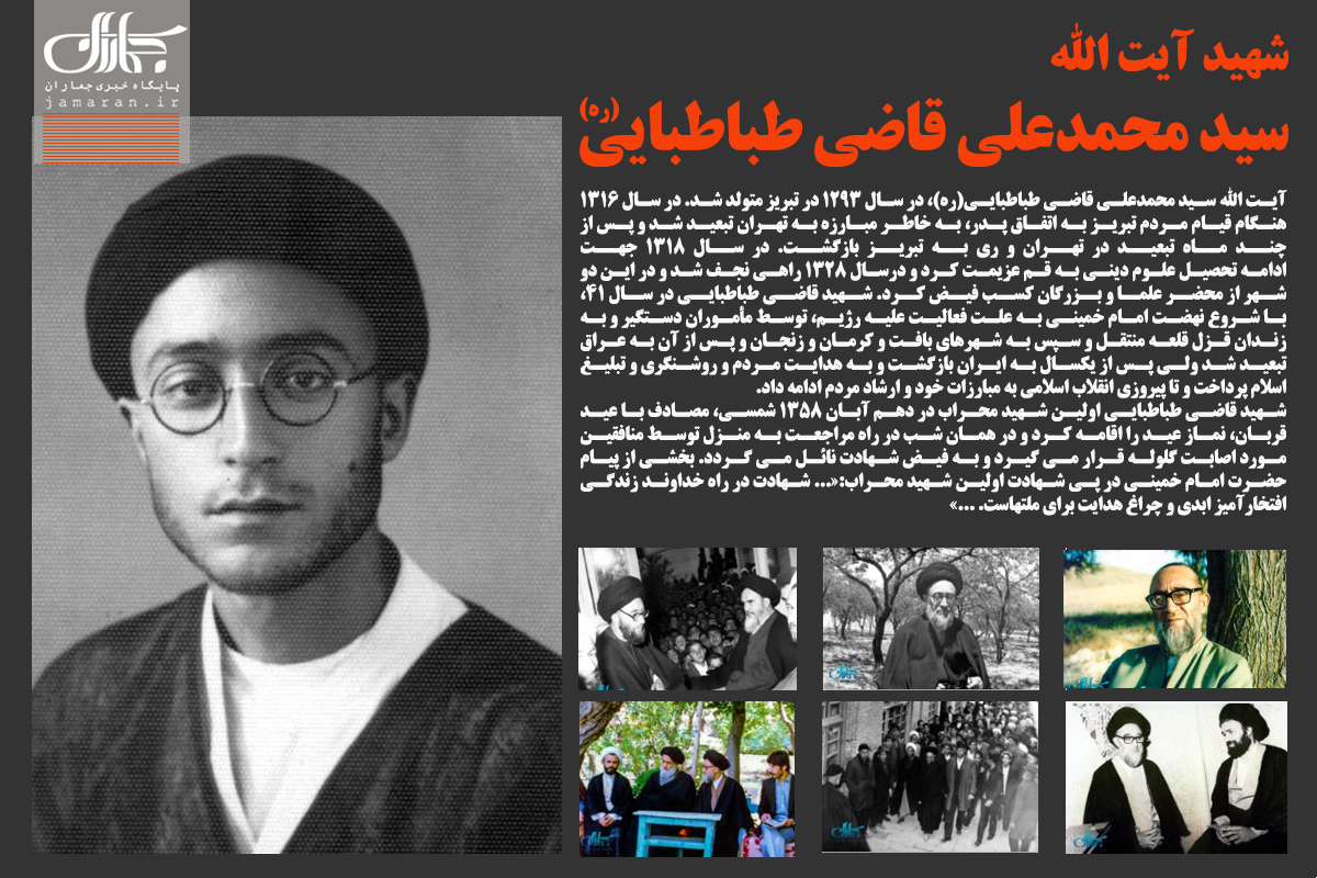 به گزارش جماران، آیت الله سید محمدعلی قاضی طباطبایی(ره)، در سال ۱۲۹۳ در تبریز متولد شد. در سال ۱۳۱۶ هنگام قیام مردم تبریز به اتفاق پدر، به خاطر مبارزه به تهران تبعید شد و پس از چند ماه تبعید در تهران و ری به تبریز بازگشت. در سال ۱۳۱۸ جهت ادامه تحصیل علوم دینی به قم عزیمت کرد و درسال ۱۳۲۸ راهی نجف شد و در این دو شهر از محضر علما و بزرگان کسب فیض کرد. شهید قاضی طباطبایی در سال ۴۱، با شروع نهضت امام خمینی به علت فعالیت علیه رژیم، توسط مأموران دستگیر و به زندان قزل قلعه منتقل و سپس به شهرهای بافت و کرمان و زنجان و پس از آن به عراق تبعید شد ولی پس از یکسال به ایران بازگشت و به هدایت مردم و روشنگری و تبلیغ اسلام پرداخت و تا پیروزی انقلاب اسلامی به مبارزات خود و ارشاد مردم ادامه داد. شهید قاضی طباطبایی اولین شهید محراب در دهم آبان ۱۳۵۸ شمسی، مصادف با عید قربان، نماز عید را اقامه کرد و در همان شب در راه مراجعت به منزل توسط منافقین مورد اصابت گلوله قرار می گیرد و به فیض شهادت نائل می گردد. بخشی از پیام حضرت امام خمینی در پی شهادت اولین شهید محراب:«... شهادت در راه خداوند زندگی افتخارآمیز ابدی و چراغ هدایت برای ملتهاست. ...» (صحیفه امام، ج۱۰، ص: ۴۲۰ و ۴۲۱)