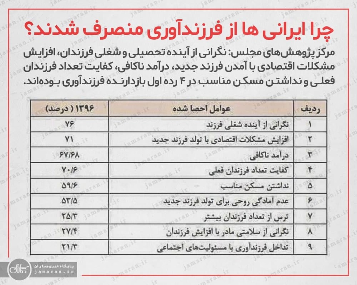 مرکز پژوهشهای مجلس اعلام کرد: نگرانی از آینده تحصیلی و شغلی فرزندان، افزایش مشکلات اقتصادی با آمدن فرزند جدید، درآمد ناکافی، کفایت تعداد فرزندان فعلی و نداشتن مسکن مناسب در ۴ رده اول بازدارنده فرزندآوری بودهاند.