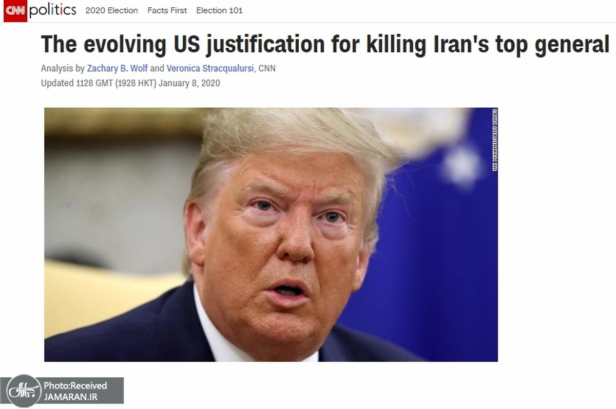 به گزارش جماران، سی ان ان در تحلیلی در تاریخ ۸ ژانویه ۲۰۲۰ نوشت: هنگامی که برای نخستین بار خبر ترور ژنرال ارشد ایرانی «قاسم سلیمانی» توسط دولت آمریکا اعلام شد، از مقامات پنتاگون گرفته تا دونالد ترامپ رئیس جمهور آمریکا، مراقب بودند که اینگونه جلوه دهند که این حمله به منظور خاتمه دادن به یک حمله قریب الوقوع به آمریکایی ها صورت گرفته است.