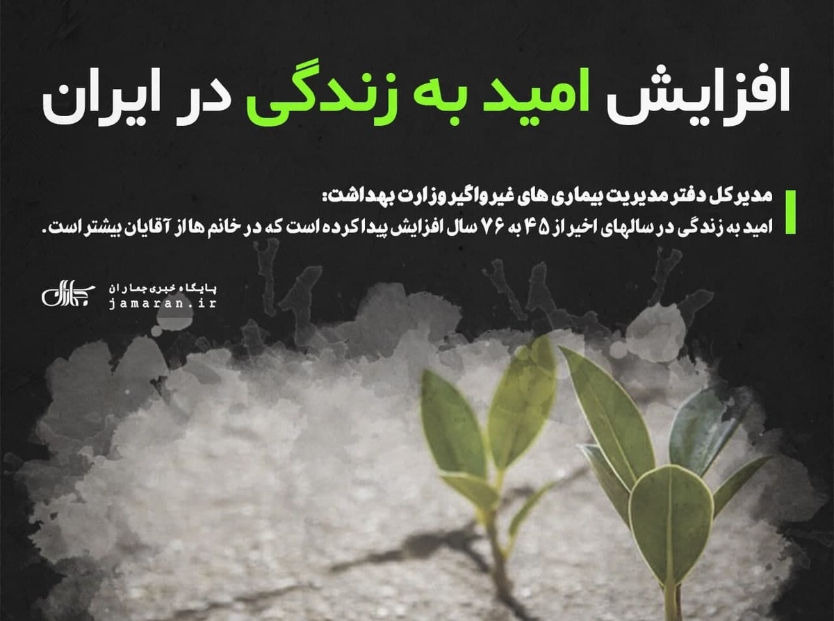 مدیرکل دفتر مدیریت بیماری های غیرواگیر وزارت بهداشت گفت: امید به زندگی در سالهای اخیر از ۴۵ به ۷۶ سال افزایش پیدا کرده است که در خانم ها از آقایان بیشتر است.