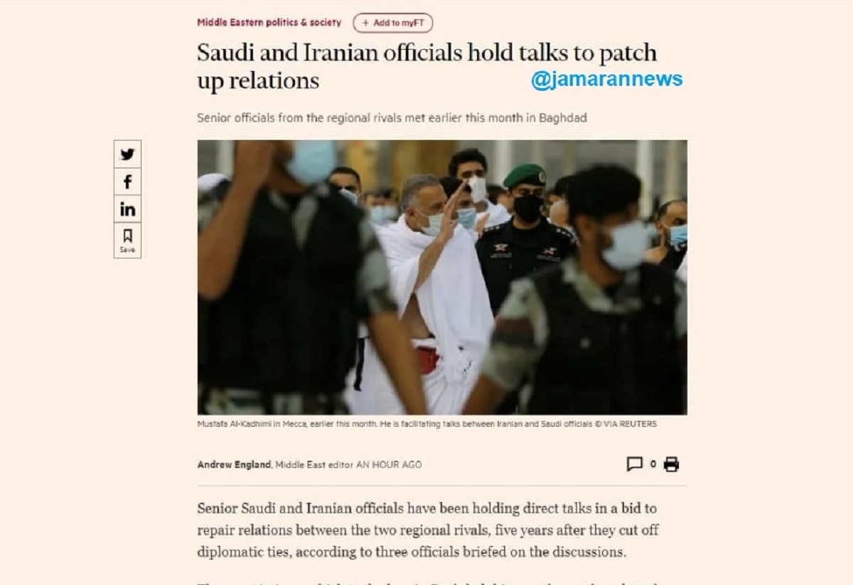 فایننشال تایمز نوشت: گفت و گو توسط مقامات ارشد ایران و عربستان سعودی انجام شد. هدف از این مذاکرات، اصلاح روند روابط میان دو طرف است. مرحله اول مذاکرات، در ماه جاری میلادی در بغداد انجام شد. مصطفی الکاظمی که اخیرا به عربستان سفر کرده تسهیل کننده مذاکرات است.