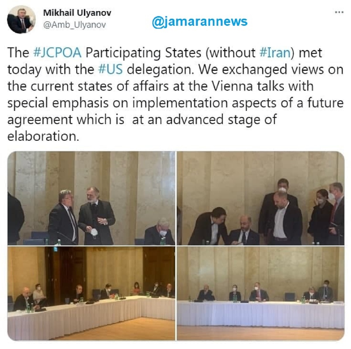 میخائیل اولیانوف رئیس هیات روسیه در مذاکرات برجام در توئیتی نوشت: «در این جلسه ما درباره آخرین وضعیت مذاکرات وین بحث و تبادل نظر کردیم. در این نشست جنبههای اجرائی یک توافق آتی (درباره احیای برجام) که در مرحله پیشرفته تدوین قرار دارد به طور ویژه مورد تاکید قرار گرفت.»