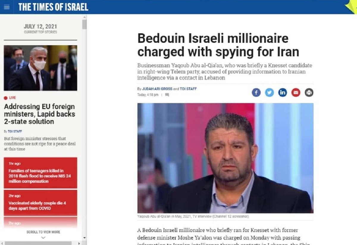 یعقوب ابوالعیقان که مدت کوتاهی هم نامزد عضویت کنست (پارلمان) از حزب راستگرای تِلِم بود، متهم است که بواسطه یک رابط لبنانی، اطلاعاتی را در اختیار ایران گذاشته است.