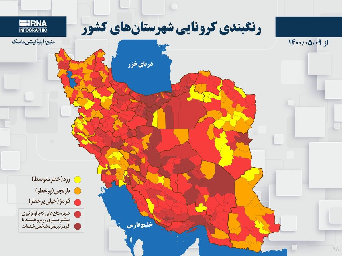 طبق گزارش وزارت بهداشت در روز دوشنبه ۱۱ مرداد ۱۴۰۰، در حال حاضر ۲۸۵ شهر کشور در وضعیت قرمز، ۱۱۰ شهر در وضعیت نارنجی، ۵۳ شهر در وضعیت زرد قرار دارند.