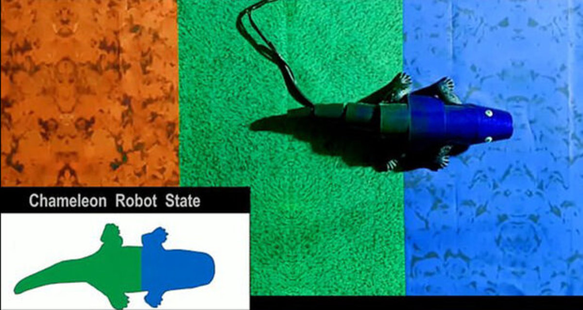 تصاویری از ربات آفتاب پرست نشان میدهد این ابزار هنگام گذر از روی پس زمینه با رنگها و بافتهای مختلف، میتواند رنگ خود را تغییر دهد. این ربات هنگام گذر از هر بخش رنگی، به تدریج رنگ خود را تغییر میدهد.