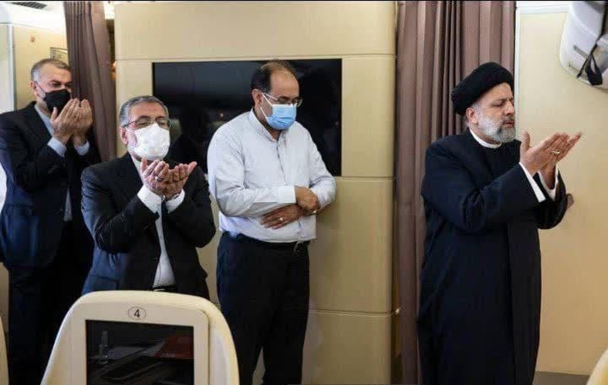 تصویری از سید ابراهیم رئیسی رییس جمهوری کشورمان و هیأت همراه در حال اقامه نماز در هواپیما در سفر تاجیکستان؛ در این تصویر نماینده اهل سنت هم دیده می شود.