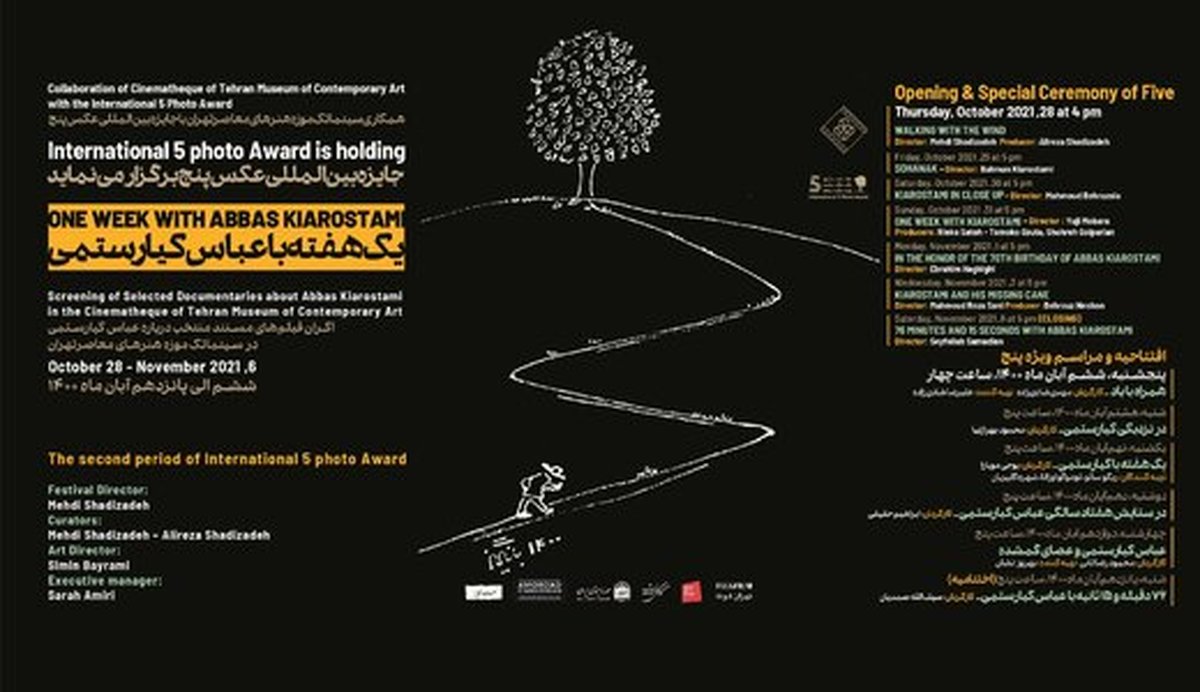 مهدی شادیزاده دبیر و موسس جایزه بین المللی عکس پنج از مراسم اختتامیه امسال این جشنواره و همکاری با سینماتک موزه هنرهای معاصر تهران گفت: «در این مراسم برای اولین بار ترکیبی از مستندهای منتخب از این کارگردان در روز پنج شنبه ششم آبان در ساعت چهار بعد از ظهر در موزه هنرهای معاصر تهران نمایش داده میشود.»
