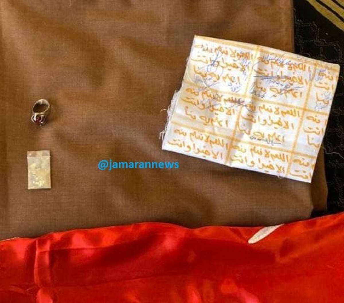 تصویری دیده نشده از کفن شهید سلیمانی به همراه پرچم سیدالشهدا(ع)، انگشتر و عبای رهبر انقلاب و امضای چهل نفر از مومنین منتشر شد.