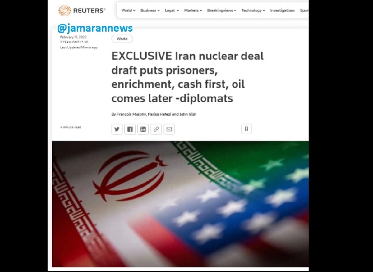 خبرگزاری رویترز در گزارشی مدعی شده است که به سندی ۲۰ صفحه ای دست یافته که طبق آن توافقی برای احیای برجام شامل (کاهش سطح غنیسازی تا ۵٪در ایران، آزادسازی ۷ میلیارد دلار پول بلوکه شده ایران در کرهجنوبی و تبادل زندانیان ایران با اروپا و آمریکا در گام نخست) می شود.