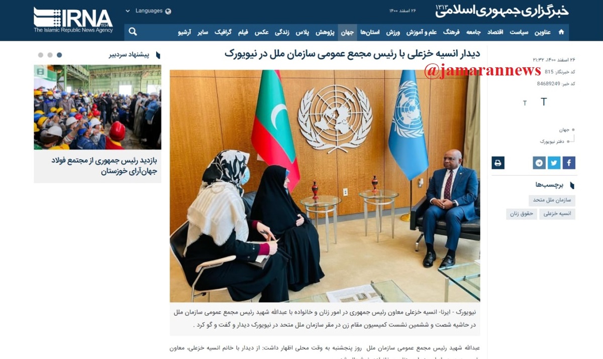 دیشب خبرگزاری ایرنا خبری در رابطه با دیدار خانم «انسیه خزعلی» معاون رئیس جمهوری در امور زنان و خانواده کشورمان با آقای «عبدالله شهید» رئیس مجمع عمومی سازمان ملل منتشر کرده بود.