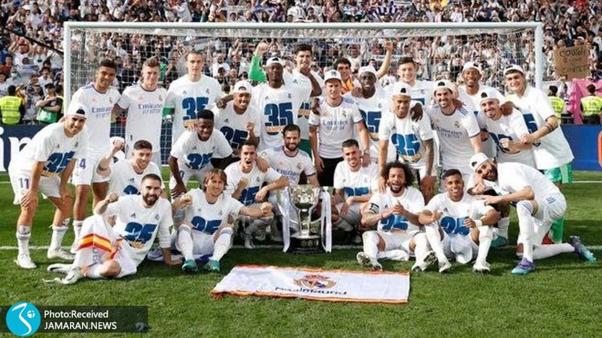 جی پلاس؛ شاگردان کارلو آنچلوتی امشب با پیروزی ۴ بر صفر مقابل اسپانیول و در حضور تماشاگران خود به قهرمانی لالیگا دست یافتند. پس از اتمام بازی، بازیکنان این تیم به خوشحالی پرداختند و با پوشیدن پیراهن هایی که نشانگر سی و پنجمین قهرمانی این تیم در تاریخ لالیگا است، جشن قهرمانی خود را برگزار کردند.