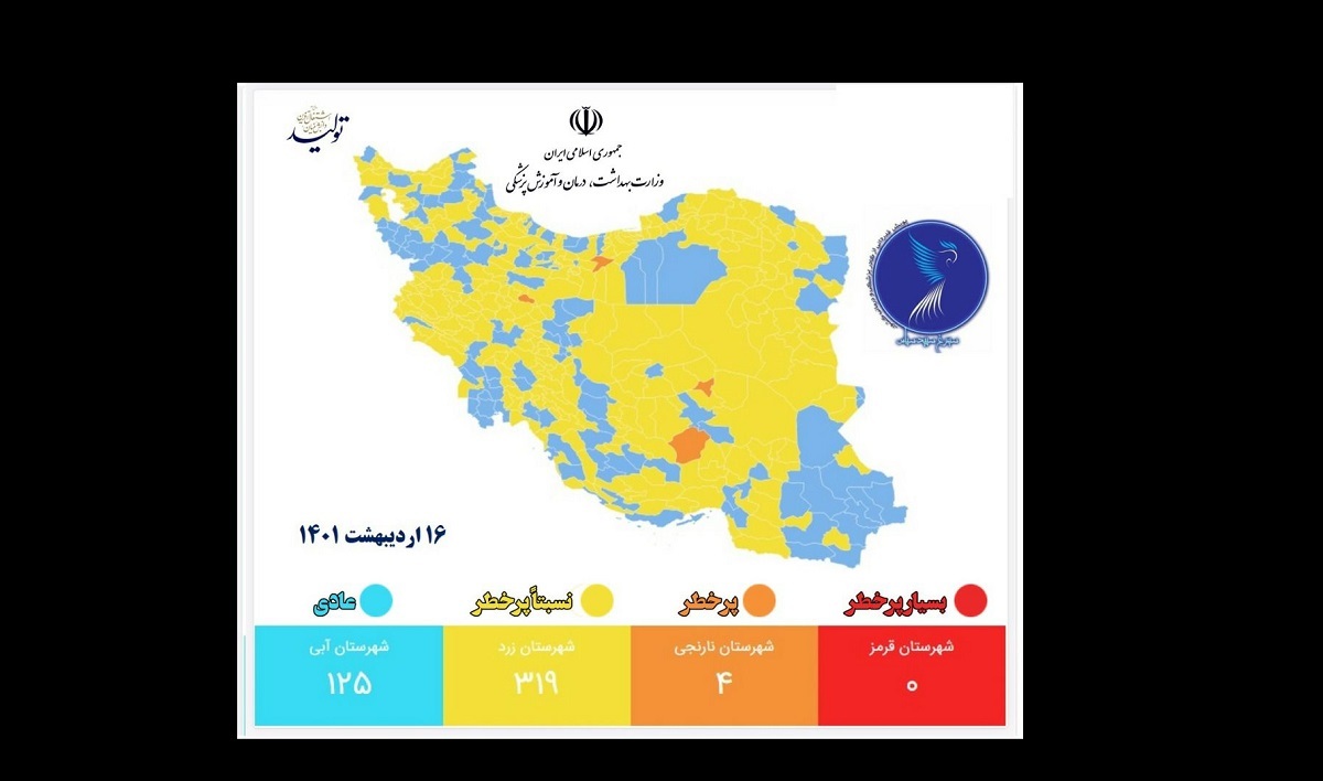 نقشه کرونایی جدید کشور، ۱۶ اردیبهشت ۱۴۰۱/ ۴۴۴ شهر در وضعیت زرد و آبی + لیست کامل رنگبندی شهرها
