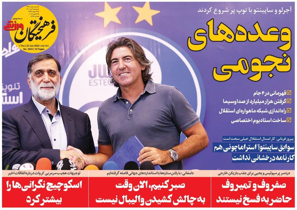 روزنامه های ورزشی امروز (پنج شنبه) ۲ تیر ۱۴۰۱ عناوین اصلی خود را به معارفه ریکاردو ساپینتو به عنوان سرمربی استقلال اختصاص داده اند.