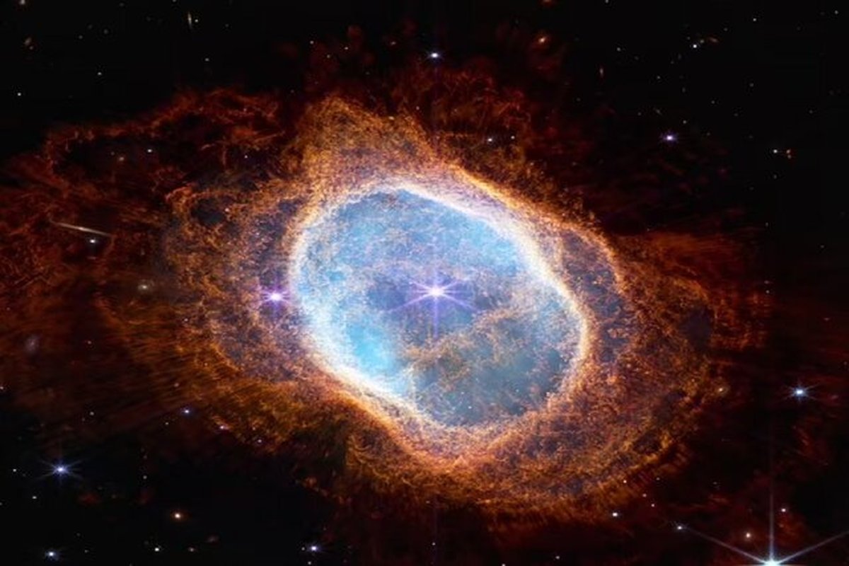 نماهای سحابی حلقه جنوبی و جفت ستارههای آن با ابزارهای جیمز وب موسوم به NIRCam و MIRI شکار شده است. در این تصویر، این ستارهی کمنور و در حال مرگ، گاز و غباری را که جیمز وب با جزئیات بیسابقهای ثبت کرده است، بیرون میدهد.