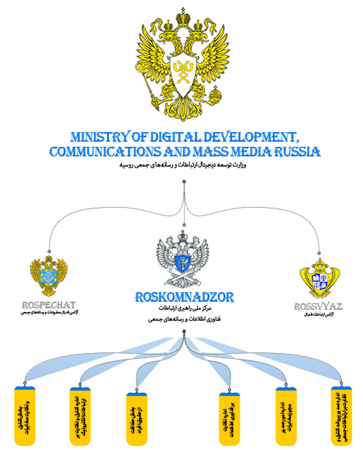وزارت توسعه دیجیتال، ارتباطات و رسانههای جمعی روسیه از بخشهای مختلفی از جمله آژانس ارتباطات فدرال (Rossvyaz)، آژانس فدرال مطبوعات و رسانههای جمعی (Rospechat) و مرکز ملی راهبری ارتباطات، فناوری، اطلاعات و رسانههای جمعی (Roskomnadzor) تشکیل شده است. سانسور اینترنت در روسیه بر اساس چندین قانون و از طریق مکانیزمهای مختلفی اجرایی میشود. از سال 2012، روسیه یک لیست سیاه متمرکز اینترنتی تهیه کرد که توسط سرویس فدرال نظارت بر ارتباطات، فناوری اطلاعات و رسانههای جمعی یا همان «روس کام نازور» نگهداری میشود. این لیست سیاه برای فیلتر کردن برخی URLها، نامهای دامنه و آدرسهای IP استفاده میشود. «روس کامنازور» یک نهاد اجرایی فدرال در روسیه است که وظیفه اصلی آن، کنترل و نظارت بر رسانهها است. «روس کامنازور» از زیر مجموعههای مختلفی تشکیل شده است. «اداره صدور پروانه و کنترل و نظارت بر ارتباطات جمعی»، «اداره صدور مجوز مخابرات»، «اداره نظارت بر فناوری اطلاعات»، «بخش حفاظت از حقوق افراد»، «اداره کنترل و نظارت بر ارتباطات الکترونیک» و «بخش کنترل و نظارت مخابرات» از جمله زیرشاخههای اصلی این نهاد هستند.