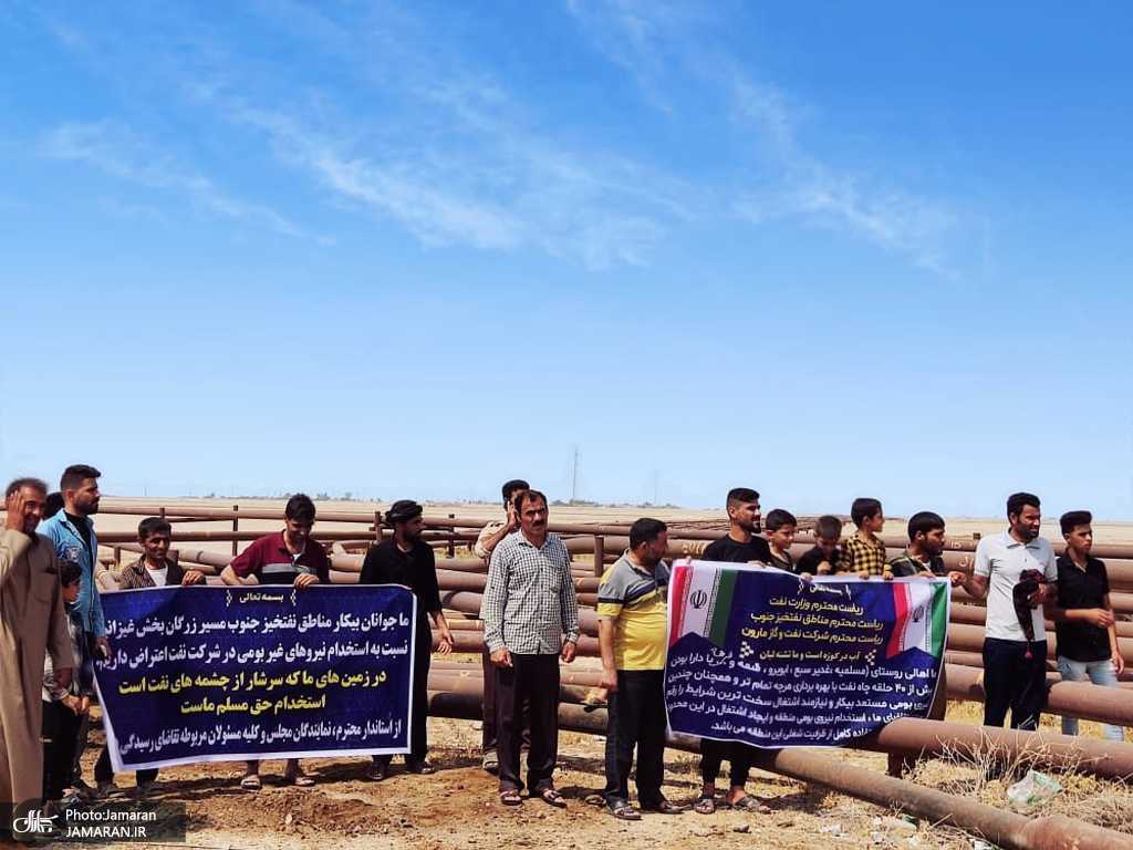 جوانان روستاهای نفتخیز بخش غیزانیه اعتراض دارند که نیروهای غیر بومی در واحدهای شرکت نفت به کار گرفته میشود و به آنها توجهی نمیشود.