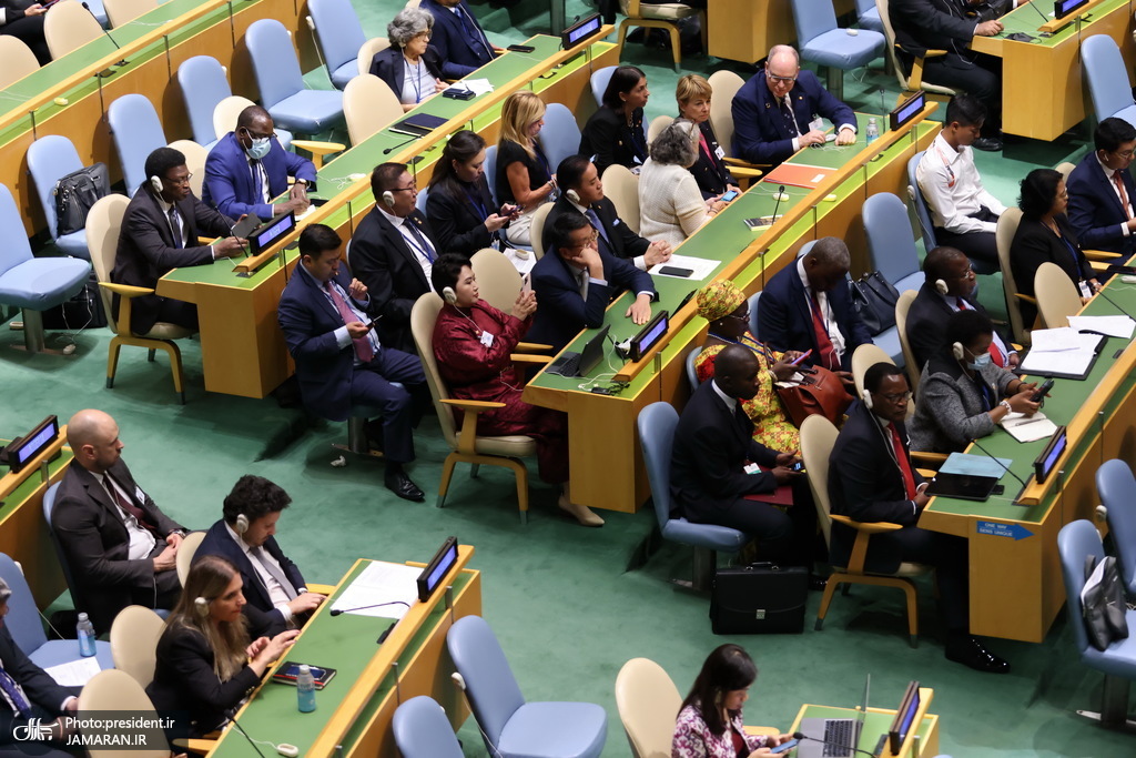همهی ملتهای آزاده، دل در گرو این ارزشهای والا دارند اما همین سلسله باورها، دلیل همهی دشمنیِ ظالمان جهان با ماست. آنچه ما میخواهیم حقوق ملت ایران است و رابطه مبتنی بر ظلم را برنمیتابیم. ما پای حقوق ملت خود ایستادهایم. ما بر این باوریم که هرگونه رابطهی ستمگری به ضرر صلح و امنیت جهانی است و مهمترین تهدید برای جامعه جهانی، "عادیانگاری ظلم" است. دست یافتن به امنیت جهانی از هر طریقی غیر از عدالت، پایدار نخواهد ماند و این همان چیزی است که ما از سازمان ملل انتظار داریم انجام دهد.