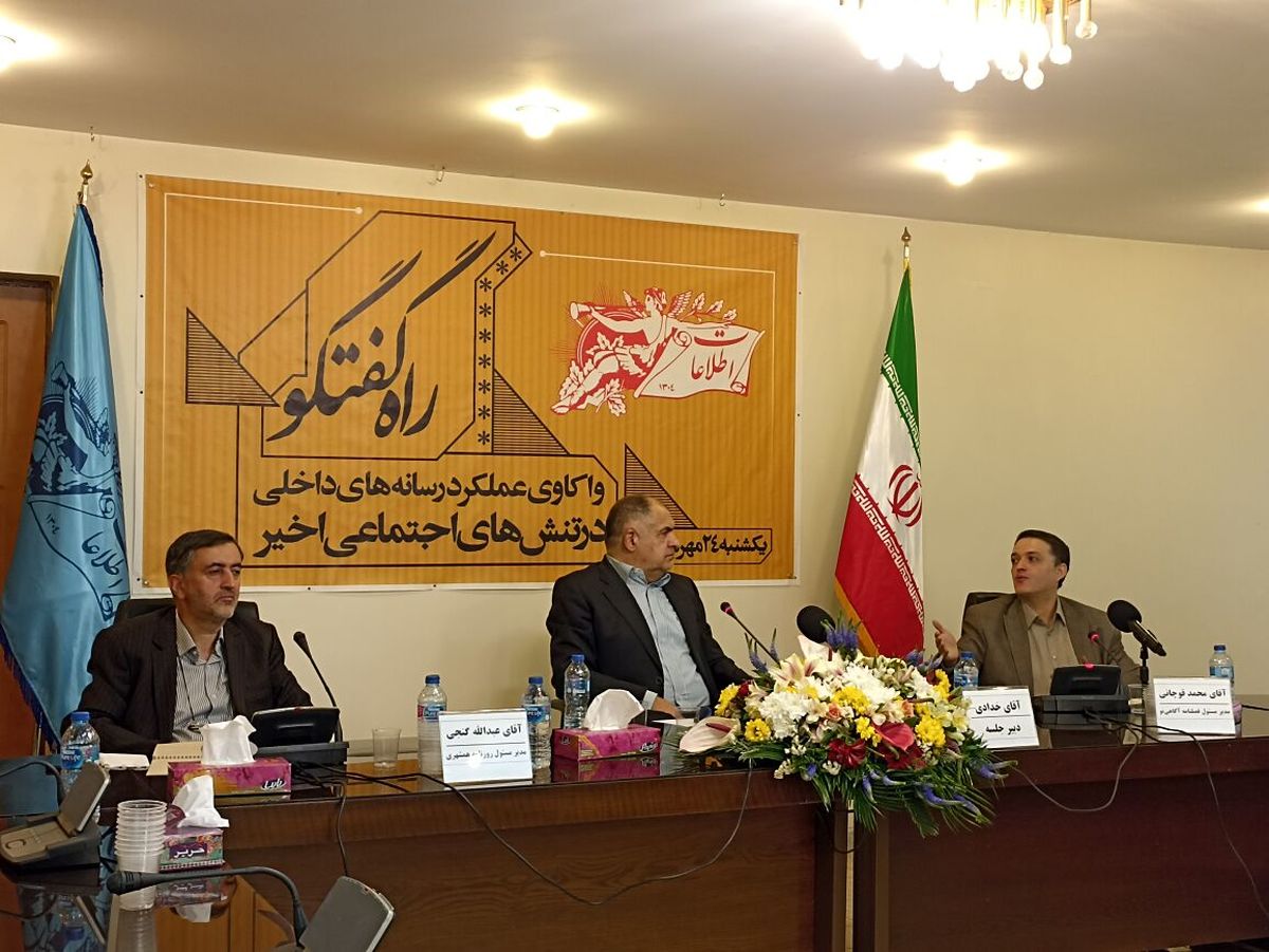 نشست واکاوی عملکرد رسانههای داخلی در تنشهای اجتماعی اخیر با حضور عبدالله گنجی، مدیرمسئول روزنامه همشهری و محمد قوچانی، مدیرمسئول فصلنامه آگاهی نو، امرروز یکشنبه -۲۴ مهر ماه - در سالن کنفرانس روزنامه اطلاعات برگزار شد.