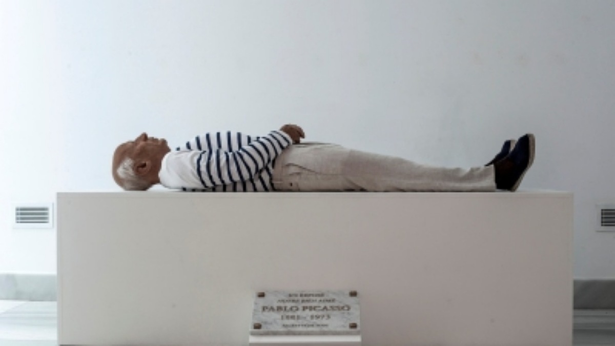 باشگاه خبرنگاران جوان نوشت؛ بدن بی جان پابلو پیکاسو مبنای اثری از هنرمند اسپانیایی «اوخنیو مرینو» (Eugenio Merino) شده است که عنوان (Aquí Murió Picasso) «پیکاسو اینجا درگذشت» را دارد و درواقع، به جای این که بر اساس جسد واقعی پیکاسو ساخته شده باشد، از تصویری الهام میگیرد که در ذهن و باور بسیاری از مردم، تصویر پیکاسو را تداعی میکند؛ یعنی مردی که پیراهن برتون با راه راه آبی و شلوار کتان سفیدی را پوشیده است و اندازه کار، بسیار بزرگتر از اندازه واقعی است؛ به طوری که اگرچه گفته میشود پیکاسو قدی ۱۶۵ سانتی داشته است، ولی این مجسمه هنرمند اسپانیایی ابعادی از یک مرد ۱۸۰ سانتی متری را نشان میدهد.
