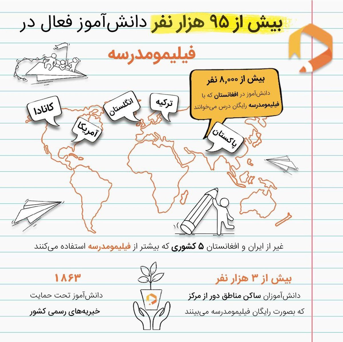 همچنین با توجه به مشکلاتی که برای دختران دانش آموز در افغانستان پیش آمد و اعلام خبر استفاده رایگان دانش آموزان افغانستانی از فیلیمو مدرسه، در سه ماهه زمستان بیش از ۸هزار کاربر افغانستانی با حضور در مدرسه کمک درسی آنلاین فیلیمو، از امکانات آموزشی آن بهرهمند شدند. علاوه بر افغانستان، دانش آموزانی از کشورهای پاکستان، ترکیه، انگلستان، آمریکا و کانادا هم به ترتیب بیشترین استفاده از فیلیمومدرسه را به خود اختصاص دادهاند.