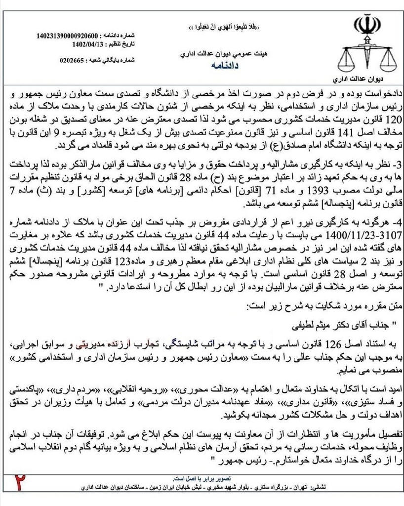 هیئت عمومی دیوان عدالت اداری رأی به ابطال حکم "میثم لطیفی" رییس سازمان اداری استخدامی کشور داد.